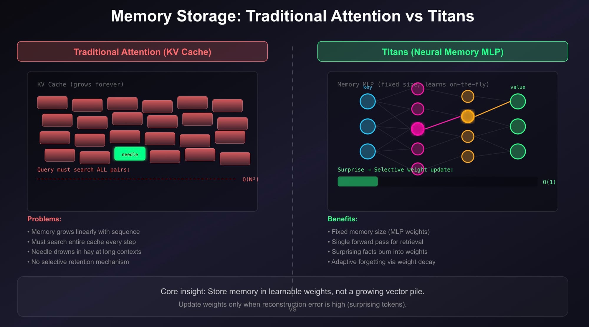 - Titans Architecture: Because this sentence is highly unexpected (high surprise), it triggers a sharp gradient update. The memory module’s weights are physically altered to accommodate this fact.